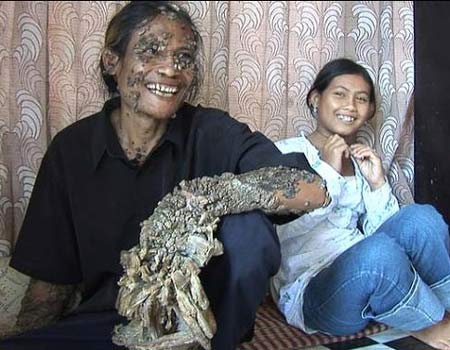 Siğillerin zamanla büyümesiyle vücudunda ağaç kökleri gibi uzantılar oluşan Endonezyalı balıkçı, önce işini daha sonra eşini kaybetti. Kocasının bu halinden şikayetçi olan kadın, iki çoçuğunu da geride bırakarak evi terk etti.