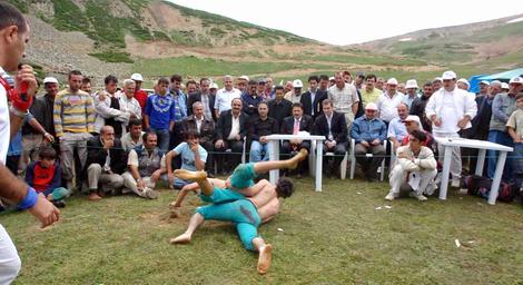 Kaçkar Dağı eteklerindeki Salikvan Yaylası'nda yapılan şenlikte bir yanda boğalar diğer yanda 100'e yakın pehlivan güreşti.