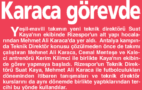 Yeşil Mavili takımın yeni teknik direktörü Suat Kaya'nın ekibinde Rizespor alt yapı hocalarından M. Ali Karaca da yer aldı.