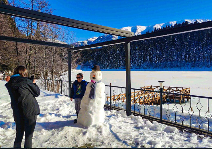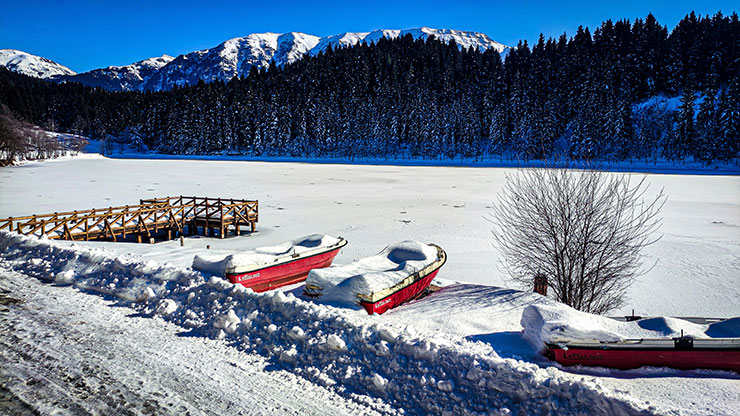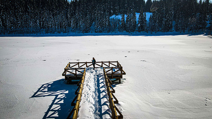 Karagöl’ün buz tutmuş halini görmek isteyenler günü birlik gidip, temiz havası ve muhteşem doğanın tadını çıkartıyor. Güvenlik amaçlı gölün üzerine çıkmak yasaklanırken, buz tutan Karagöl havadan görüntülendi.