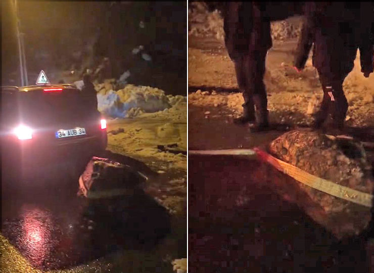 O esnada trafikte olan 34 AUB 34 plakalı aracın sürücüsü Erhan Seydioğlu, çevredekilerin de yardımıyla kayayı çekme halatı ile aracının arkasına bağladı.