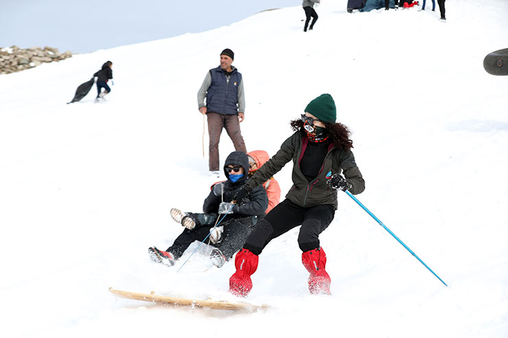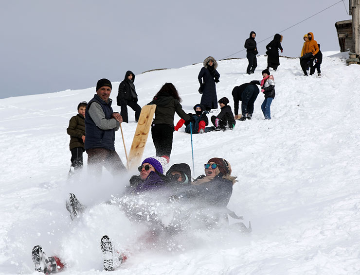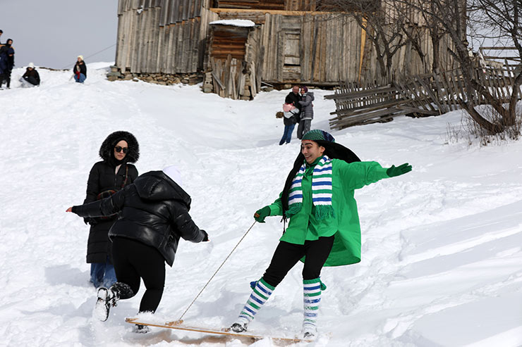 Yerli ve yabancı turistlerin mangal yakıp horon oynayarak karın tadını çıkardığı şenlikte, bazıları da naylon poşetlerle kaymaya çalıştı.