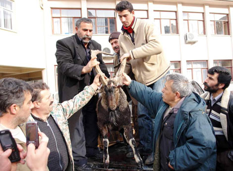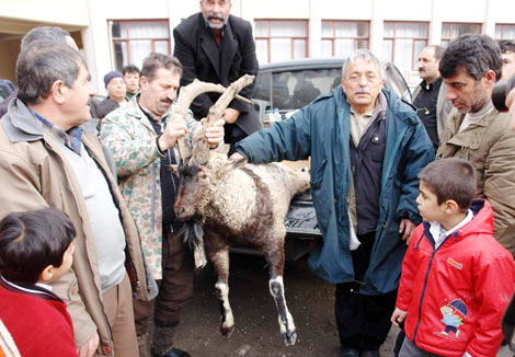 Artvin'in Yusufeli ilçesinde, Halil İbrahim Bingöl isimli avcı, özel izinle avladığı dağ keçisini ilçe merkezine getirerek sergiledi.
