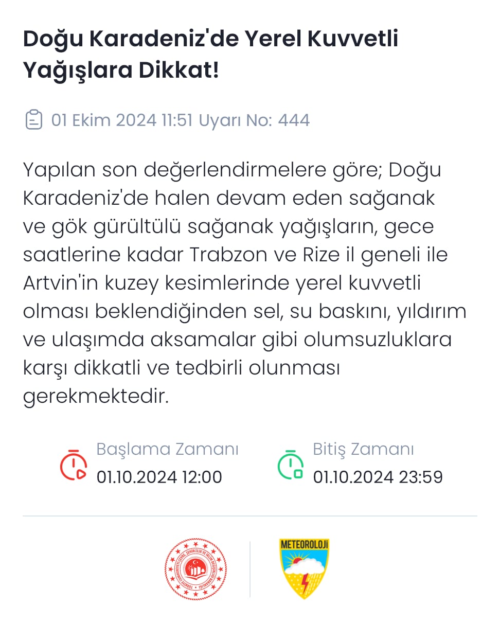 Meteorolojiden yapılan uyarıda, "Yapılan son değerlendirmelere göre; Doğu Karadeniz'de halen devam eden sağanak ve gök gürültülü sağanak yağışların, gece saatlerine kadar Trabzon ve Rize il geneli ile Artvin'in kuzey kesimlerinde yerel kuvvetli olması beklendiğinden sel, su baskını, yıldırım ve ulaşımda aksamalar gibi olumsuzluklara karşı dikkatli ve tedbirli olunması gerekmektedir." denildi.