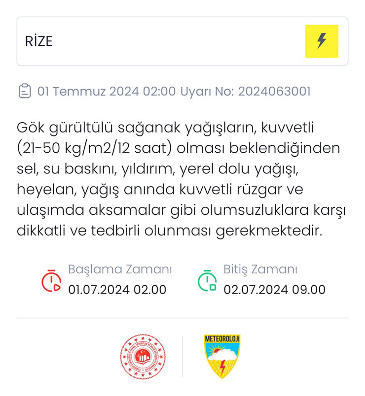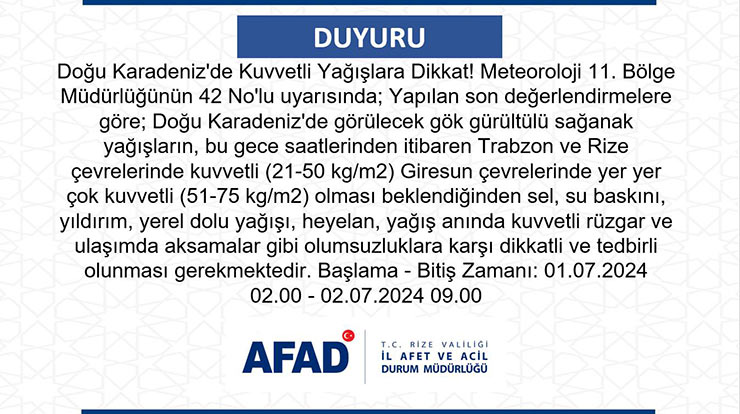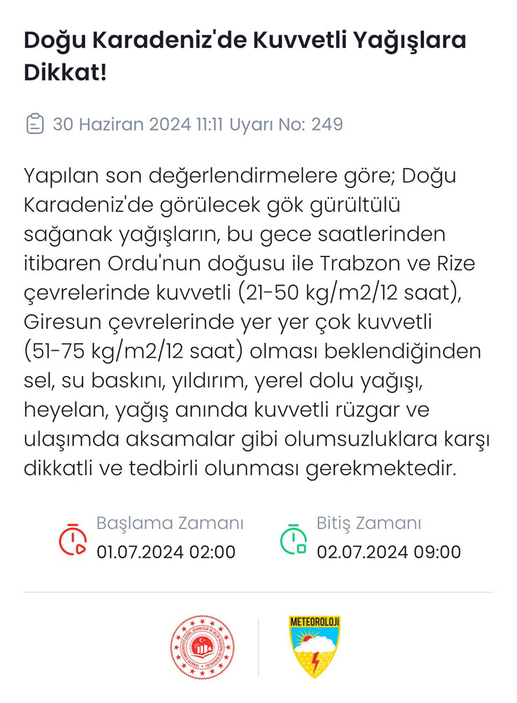 Meteorolojiden verilen bilgide, "Yapılan son değerlendirmelere göre; Doğu Karadeniz'de görülecek gök gürültülü sağanak yağışların, bu gece saatlerinden itibaren Ordu'nun doğusu ile Trabzon ve Rize çevrelerinde kuvvetli (21-50 kg/m2/12 saat), Giresun çevrelerinde yer yer çok kuvvetli (51-75 kg/m2/12 saat) olması beklendiğinden sel, su baskını, yıldırım, yerel dolu yağışı, heyelan, yağış anında kuvvetli rüzgar ve ulaşımda aksamalar gibi olumsuzluklara karşı dikkatli ve tedbirli olunması gerekmektedir." denildi.