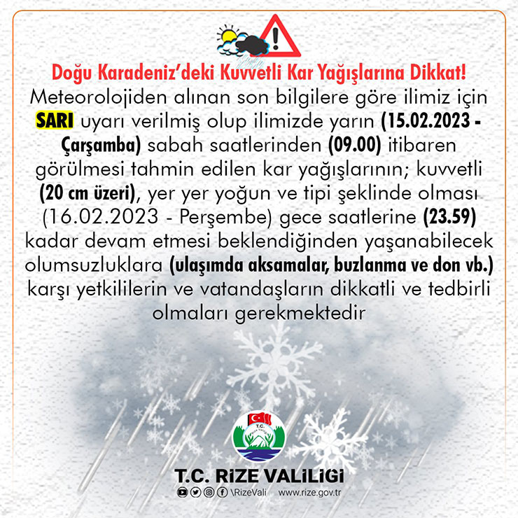 Meteoroloji Genel Müdürlüğünden yapılan açıklamaya göre, yarın sabah saatlerinden itibaren Doğu Karadeniz ile Ardahan çevrelerinde etkili olması beklenen kar yağışlarının, perşembe akşam saatlerinden sonra Giresun geneli, Rize ve Artvin'in kıyı kesimleri ile Ardahan, Gümüşhane ve Bayburt'un kuzey kesimlerinde yer yer yoğun olması öngörülüyor.