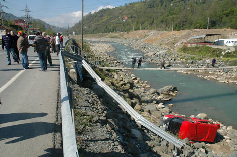 Olayda, Muhammet Kalender (51), 53 M 0330 plakalı minibüsü ile 75 yaşındaki kanser hastası olan babası Şükrü Kalender'i taşıyan ambulansı takip ederken Kerim Kazancı'nın (23) yönetimindeki 53 AV 526 plakalı araca çarparak dereye uçtu.