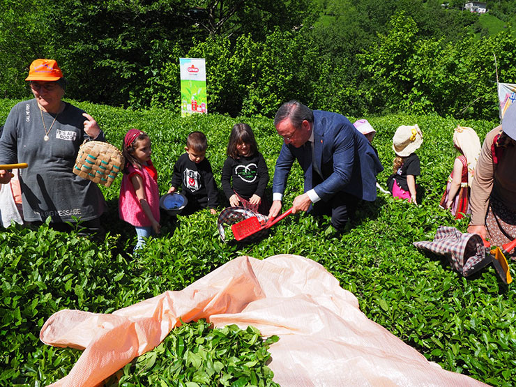 ÇAYKUR Genel Müdürü Yusuf Ziya Alim ve ilçe protokolü Kemalpaşa ilçesine bağlı Köprücü köyünde düzenlenen etkinlikte üreticiler ve çocuklarla çay hasadı gerçekleştirdi.
