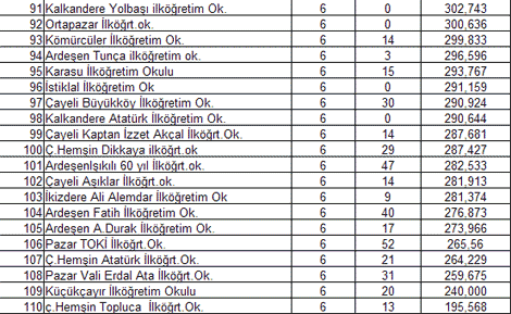Güneysu Özel Bilge İlköğretim Okulu ve Çayeli Özel Şahika İlköğretim Okulu, başarı sıralamasında devlet okullarını geride bırakarak ilk iki sırayı aldılar.