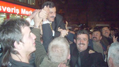 Cadde üzerinde coşkulu kutlamalar yapılırken Pazar Belediye Başkanlığı'nı kazanan Dr. Ahmet Basa omuzlara alındı.