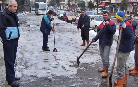 Kar yağışının ardından gece meydana gelen don olayı nedeniyle kaldırımlar adeta buz kesti. Pazar Belediye ekipleri ise kazma kürekle buz kırıyor.