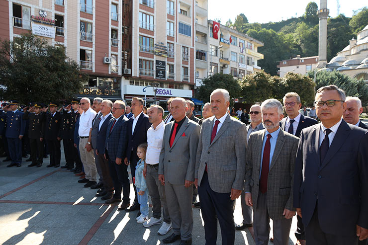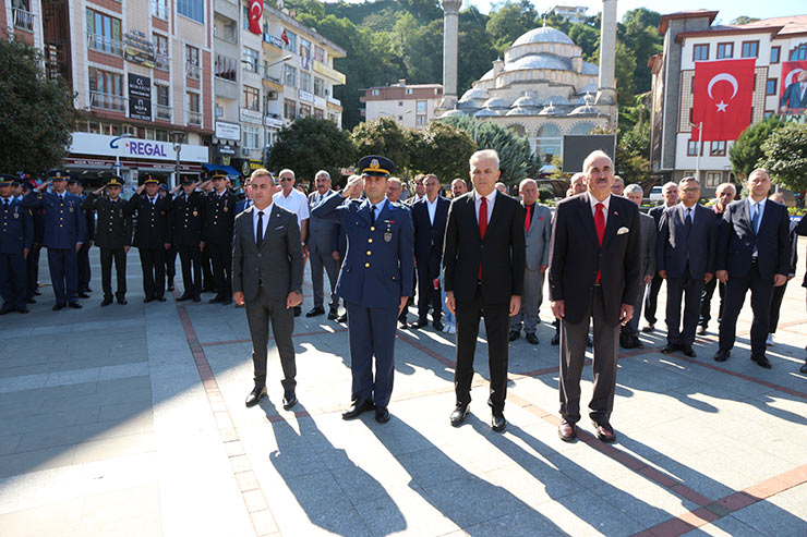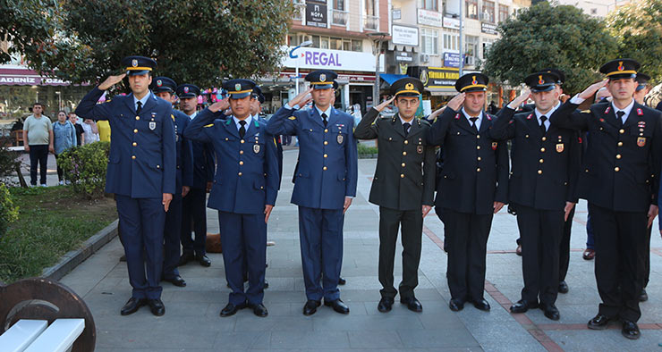 15 Temmuz Demokrasi Meydan’ındaki Atatürk Anıtına Kaymakam Mustafa Akın, Garnizon Komutanı Hava Üsteğmen İhsan Erdemir ve Belediye Başkan V. Dursun Güneş’in çelenk sunumu ile başlayan tören, saygı duruşu ve İstiklal Marşı’nın okunması ile devam etti.