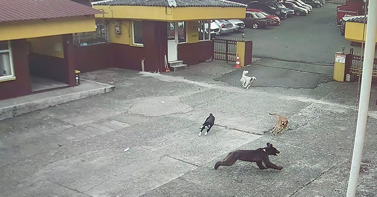 Yavru ayının bahçeye girdiğini gören sokak köpekleri, ayıyı kovalamaya başladı. Köpeklerden korkan yavru ayı koşa koşa tekrardan ormana doğru kaçtı.