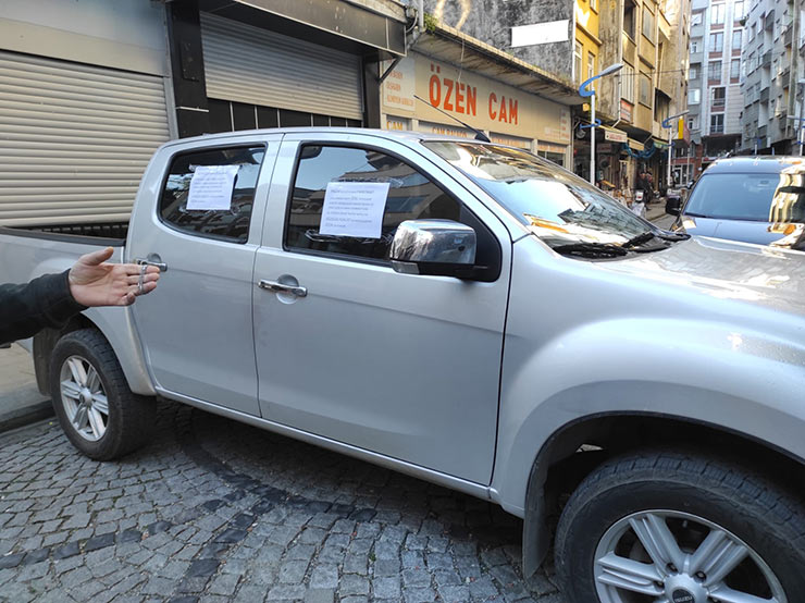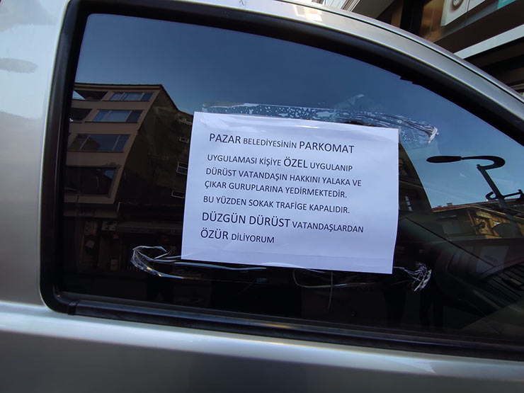 Aracıyla sokağı trafiğe kapatan esnaf, aracın üzerine ise, “Pazar Belediyesinin parkomat uygulaması kişiye özel uygulanıp, dürüst vatandaşın hakkını çıkar gruplarına yedirmektedir. Bu yüzden sokak trafiğe kapalıdır. Düzgün, dürüst vatandaşlardan özür diliyorum” yazdı.