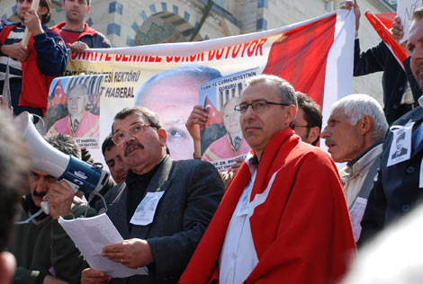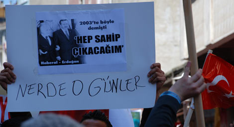 Göstericiler, Prof. Haberal ve Başbakan Erdoğan'ın kol kola çekilmiş fotoğrafı üzerindeki 'Hep sahip çıkacağım' yazısına 'Nerde o günler' şeklinde not düşülmüş pankartları taşıdılar.