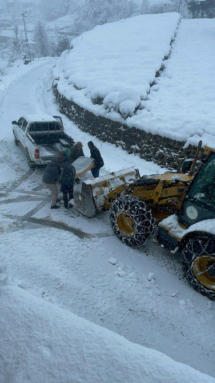Rize’nin Pazar ilçesinde kar yağışı nedeniyle köy yolu kapanınca cenaze iş makinesinin kepçe kısmına konularak taşındı.