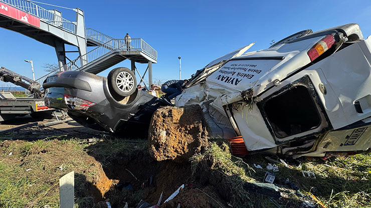 Aydınlatma direğine çarptıktan sonra takla atarak karşı şeride geçen araçların sürücüleri yaralandı.