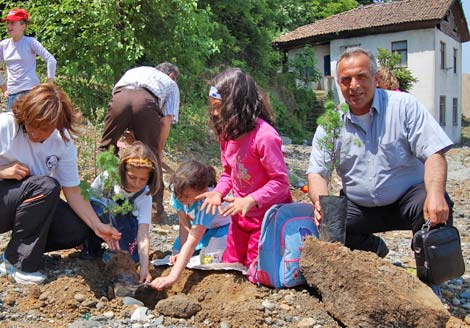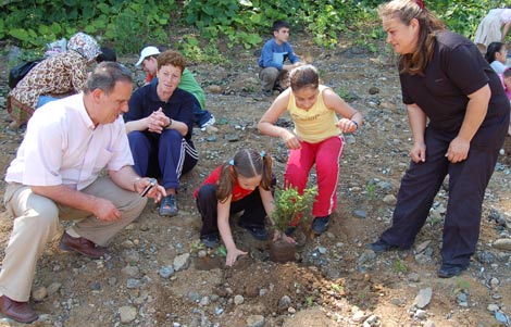 Öğretmenleri Hülya Conkar ve velileri ile Soğuksu Caddesi'nde boş bir araziye fidan diken okulun 3-A sınıfı öğrencileri, Pazar Belediyesi Fen İşleri Amiri Alaattin Atabey ile peyzaj mimarı Serap Akın'dan fidan dikimi konusunda bilgi aldı.