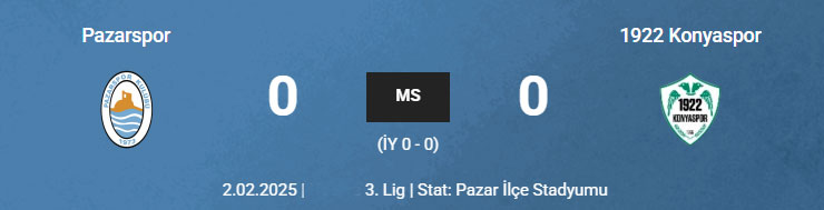 TFF 3. Lig 3. Grup 18. hafta maçında Pazarspor, kendi sahasında 1922 Konyaspor ile 0-0 berabere kaldı.