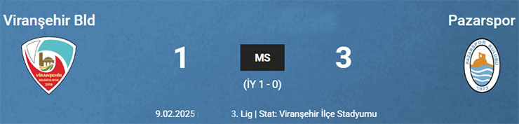 TFF 3. Lig 3. Grup 19. hafta maçında Pazarspor, deplasmanda Viranşehir Belediyespor'u 3-1 mağlup etti.