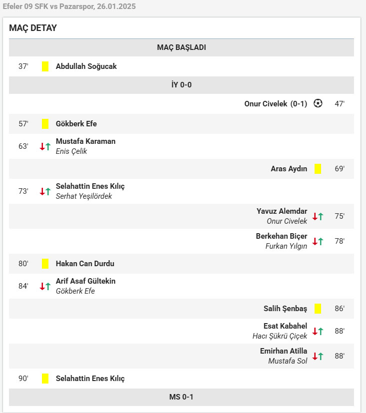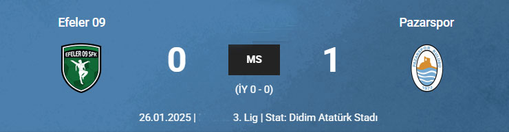 TFF 3. Lig 3. Grup 17. hafta maçında Pazarspor deplasmanda Efeler 09 SFK karşısında 1-0 galip geldi.