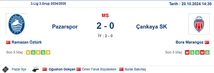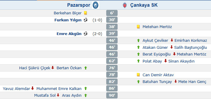 Sarı kartlar: Berkehan Biçer (Pazarspor) Metehan Mertöz, Can Demir Aktav (Çankaya SK)