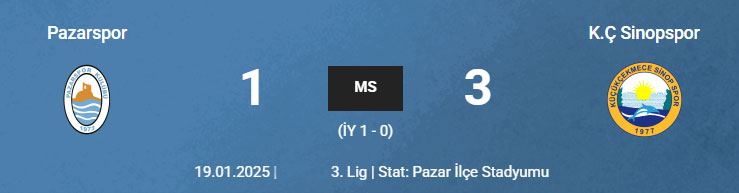 TFF 3. Lig 3. Grup 16. hafta maçında Pazarspor, kendi sahasında Küçükçekmece Sinopspor'a 3-1 yenildi.