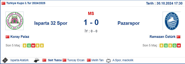 Türkiye Kupası 3. eleme turunda deplasmanda Isparta 32 Spor Kulübü ile karşı karşıya gelen Pazarspor, 90+4. dakikada yediği golle maçı 1-0 kaybederek elendi.