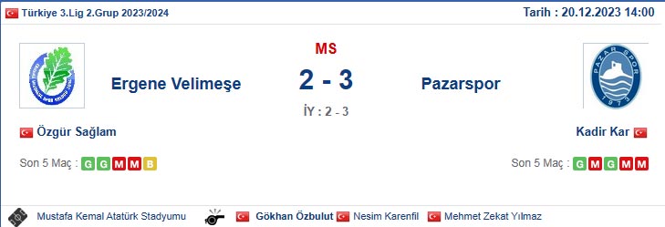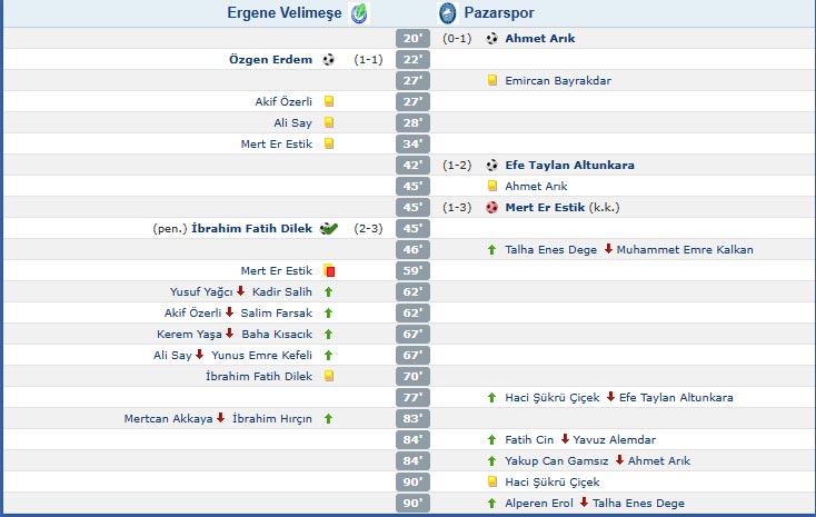 GOLLER: Dk.20 Ahmet, dk.42 Efe Taylan, dk.45 Mert Er (kk) (Pazarspor), dk.22 Özgen, dk.45+1 İbrahim Fatih (penaltı)(Ergene Velimeşe Spor)