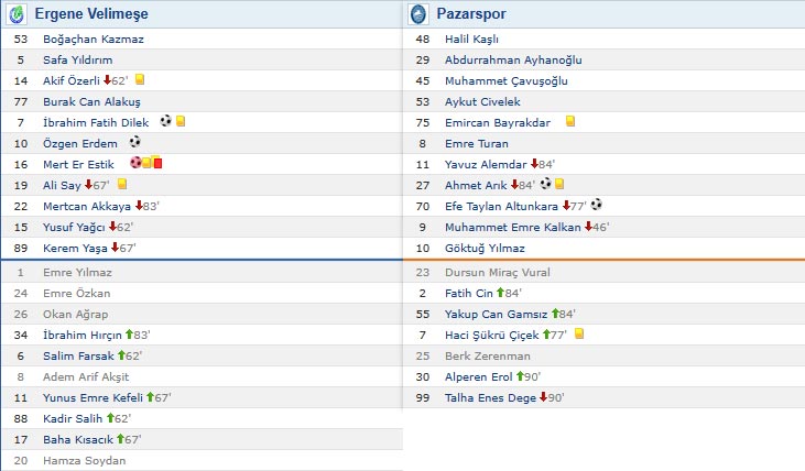 SARI KARTLAR: Dk.26 Emircan, dk.45 Ahmet, dk.90 Haci Şükrü (Pazarspor), dk.27 Akif, dk.28 Ali, dk.34 Mert Er, dk.70 İbrahim Fatih (Ergene Velimeşe Spor)
