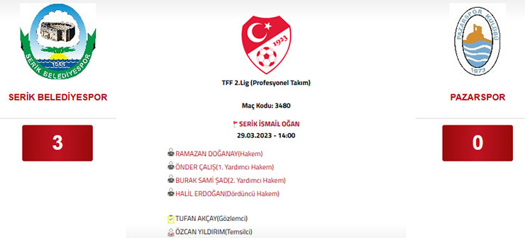 TFF 2. Lig Kırmızı Grup 29. hafta maçında Pazarspor, Serik deplasmanında 3-0 mağlup oldu...