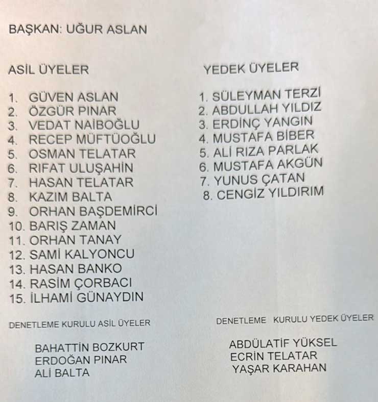 Karşılıklı suçlamaların yer aldığı konuşmaların ardından yapılan yönetim kurulu seçiminde Uğur Aslan Başkanlığındaki liste şu şekilde oluştu: