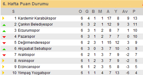 Geçen yıl ise Pazarspor 6. hafta sonunda 10 puan toplayarak puan cetvelinde 4. sırada yer almıştı. Lider Karabük'ün 3 puan gerisinde olan Pazarspor 6 maçın 3'ünden galibiyetle ayrılmış, 1 beraberlik 2 de mağlubiyet almıştı.