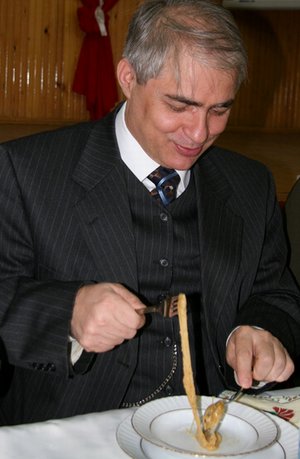 Rize Valisi Kasım Esen, yöresel muhlamayı çatalla yemeye kalkınca zor anlar yaşadı. Muhlamanın peynirini uzatarak koparmayı deneyen Vali Esen'in bu konuda zorlandığı gözlendi.(Foto: Selman KUTLU)