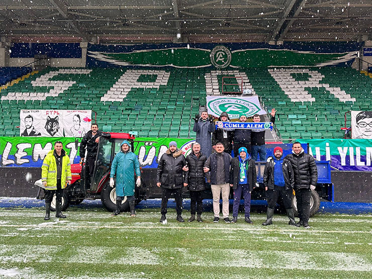 Saha zemini müsabaka saatine kadar tekrardan kar dolmaması için çabalayan stadyum görevlileri, yeni bir kar yağışı için de hazırlıklı olarak bekliyor.