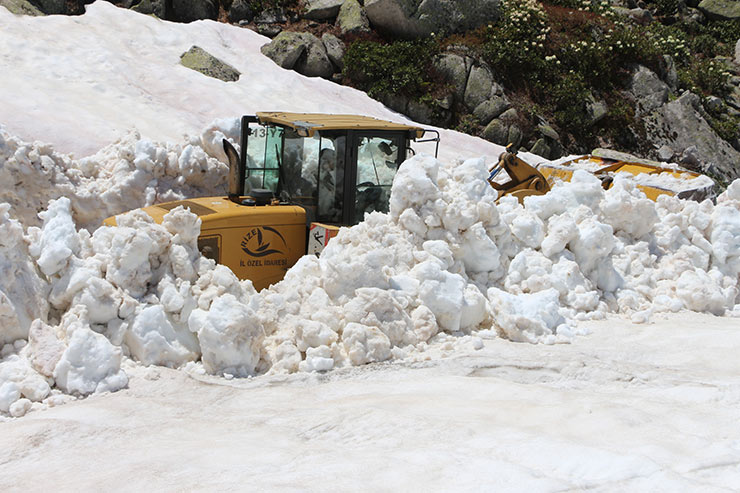 Rize'nin yüksek kesimlerinde kış mevsiminde düşen ve Haziran ayının sonuna gelinmesine rağmen henüz kalkmayan çığlar nedeniyle ulaşıma kapalı olan yollar teker teker açılıyor.