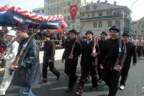 GÖKTÜRK FIRAT- ÖZGÜR TEPE - Rize'nin Rus işgalinden kurtuluşunun 89. yıl dönümü dolayısıyla bugün Rize Cumhuriyet Meydanı'nda bir tören düzenlendi. Tören temsili kurtuluş gösterisi ile başladı. Rize Belediyesi personeli ve vatandaşlardan oluşan ekip, Rize'nin düşman işgalinden kurtarılışını canlandırdı. Rus askeri tiplemesindeki Belediye personeline siyah, Rizelileri canlandıran personele ile beyaz elbiseler giydirildi. Kurusıkı silahların kullanıldığı canlandırmada bayanların da silah kullanması dikkat çekti.