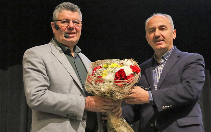 İlgiyle izlenen konferans sonunda Rize Belediye Başkanı Rahmi Metin, Alişan Kapaklıkaya’ya hediye takdim etti.