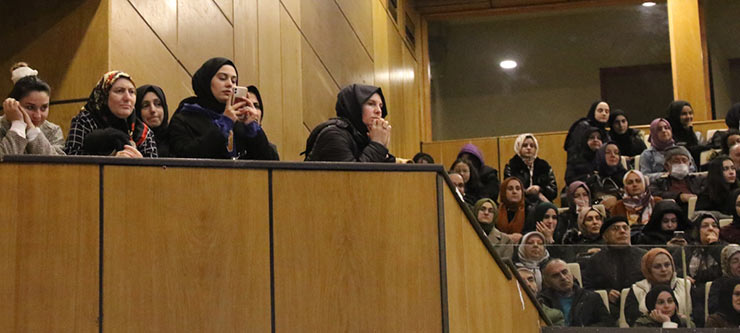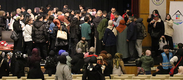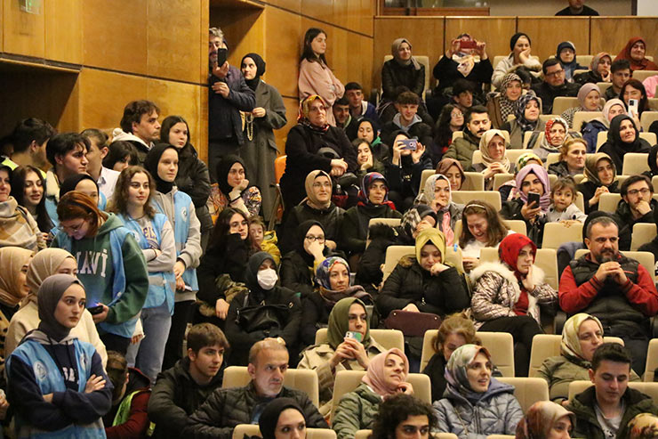 Salonun hınca hınç dolduğu etkinlikte oturabilmek için yer bulamayan izleyiciler, sahneye ve kültür merkezi koltuklarının arasındaki koridora oturarak konferansı izlediler.