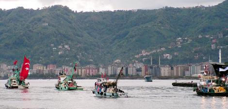 Hakkâri de 12 şehit verilmesinin ardından ülke genelinde çeşitli eylemler yapılırken Rize’de de balıkçılar balıkçı teknelerini dev bayraklarla süsleyerek Rize limanından çıkış yaptılar.