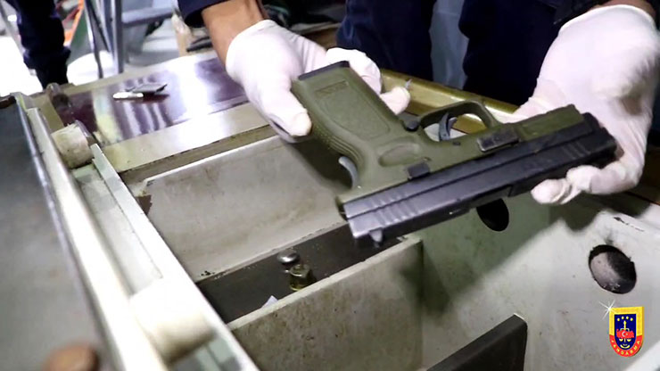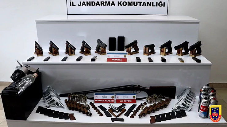 Rize Valiliği İl Basın ve Halkla İlişkiler Müdürlüğü’nden yapılan açıklamada, “Rize İl Jandarma Komutanlığı tarafından izinsiz olarak Ateşli Silah ve Mermileri İmal Eden şahıslara yönelik 02.05.2025 günü Merkez İlçe ve Kalkandere ilçesinde bulunan ev, iş yeri ve araçlarında, 6 ayrı adreste eş zamanlı olarak yapılan operasyonda; (1) adet silah atölyesi, (10) adet ruhsatsız tabanca, (1) adet ruhsatsız av tüfeği, (13) adet yarı mamul tabanca gövdesi, (14) adet yarı mamul tabanca üst kapağı, (3) adet yarı mamul tabanca namlu sürgüsü, (10) adet tabanca yayı, (13) adet pim, (1) adet gez, (4) adet ateşleme çekici, (3) adet mengene, (15) adet namlu yüksüğü, (7) adet 9 mm çapında fişek, (25) adet av tüfeği fişeği, (12) adet tabanca şarjörü, (1) adet kumlama makinesi, (1) adet CNC makinesi, (2) adet silah parlatma/taşlama makinesi, (1) adet boya atölyesi, (2) adet bıçak/kama, (3) adet cep telefonu ele geçirilmiştir. Olayla ilgili (2) şüpheli şahıs yakalanarak haklarında adli işlem başlatılmıştır. Rize İl Jandarma Komutanlığı’nca Kaçakçılık ve Organize Suçlarla Mücadele başta olmak üzere, kamu düzeni ve huzurun devamı için her türlü suç ve suçlularla mücadelede kararlılıkta görevine devam etmektedir” denildi.