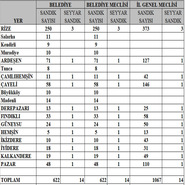 Rize merkez ilçede 109 bin 478 seçmen 373 sandıkta oy kullanacak. Güneysu’da 50 sandıkta 12 bin 650 seçmen, İyidere’de 31 sandıkta 7 bin 610 seçmen, Derepazarı’nda 25 sandıkta 6 bin 241 seçmen, Çayeli’de 146 sandıkta 34 bin 69 seçmen, Ardeşen’de 127 sandıkta 32 bin 410 seçmen, Pazar’a 110 sandıkta 16 bin 516 seçmen, Fındıklı’da 58 sandıkta 13 bin 862 seçmen, Hemşin’de 13 sandıkta 2 bin 285 seçmen, Çamlıhemşin’de 42 sandıkta 6 bin 782 seçmen, Kalkandere’de 49 sandıkta 10 bin 968 seçmen, İkizdere’de 43 sandıkta 7 bin 580 seçmen oy kullanacak.