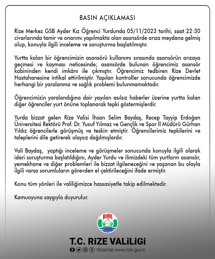 Açıklamada şunlar kaydedildi: "Vali Baydaş, yaptığı inceleme ve görüşmeler sonucunda konuyla ilgili olarak idari soruşturma başlatıldığını, Ayder Yurdu ve ilimizdeki tüm yurtların asansör, yemekhane ve diğer problemleri ile bizzat ilgileneceğini ve yaşanan bu olayla ilgili varsa sorumluların görevden el çektirileceğini ifade ermiştir. Konu tüm yönleri ile Valiliğimizce hassasiyetle takip edilmektedir."