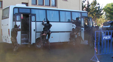 Rize İl Emniyet Müdürlüğü'nce bir otobüste teröristler tarafından rehin alınan yolcuları kurtarma tatbikatı yapıldı.