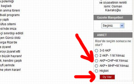 Seçimlere 1 aydan daha kısa bir süre kala Pazar53 seçmenin nabzını tutarak Rize’de tahmini seçim sonuçlarını soruyor. ‘‘Rize’de seçim sonucu ne olur?’’ sorusuna, 5 seçenekle cevap aradığımız anketimizde, her bilgisayardan sadece 1 tercih yapılabilecek. Ankete oy vereceklerin suiistimallere başvurabileceklerini var sayarak maksimum önlem aldık. Teknolojinin imkânları ölçüsünde manipülasyonlara ve IP değiştirerek birden çok oy kullanma durumlarına karşı yardımcı programlar vasıtasıyla sonuçlar takip edilerek mükerrer olduğu tespit edilen oylar anketimizden silinecektir.