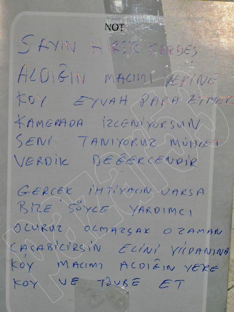 İşyerinin ön tarafındaki duvara bir yazı asan Yıldırım hırsıza şu şekilde seslendi: Sayın hırsız kardeş. Malımı yerine koy. Eyvah para etmez. Kamerada izleniyorsun. Sana mühlet verdik. Bu süreyi değerlendir. Gerçekten ihtiyacın varsa bize söyle; yardımcı oluruz. Olmazsak o zaman çalabilirsin. Elini vicdanına koy. Malımı aldığın yere koy ve tövbe et!