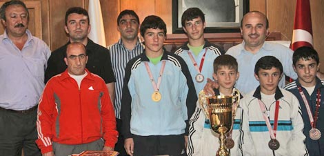 Malatya'da katıldıkları güreş turnuvasında 2 altın, 3 bronz madalya kazanan Rizeli güreşçiler, Gençlik ve Spor İl Müdürü Ömer Yılmaz'ı ziyaret etti.