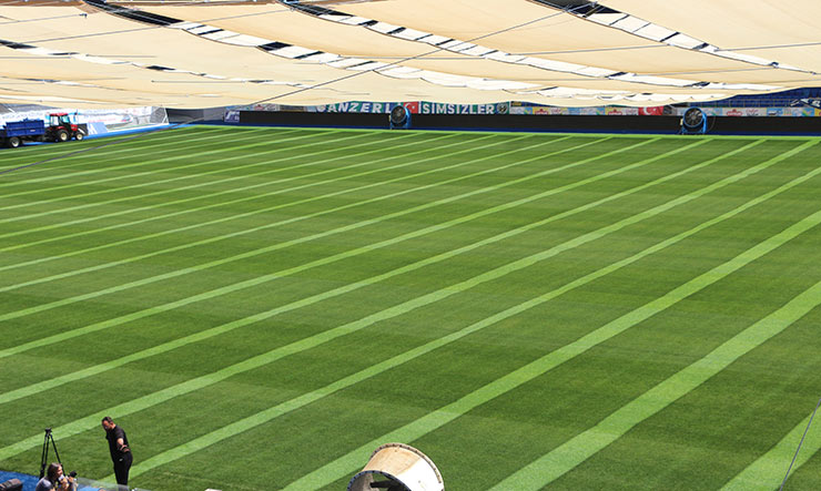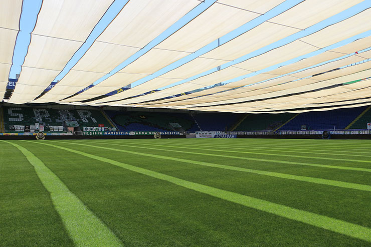 Kaliteyi korumak isteyen Çaykur Rizespor yönetimi ise ilginç bir yönteme başvurdu. Yağmurun ardından doğan güneş nedeniyle statta oluşan nem çimin çürümesine neden oluyor. Direkt vuran güneş ışınlarının çime değmemesi için çalışma başlatan kulüp yönetimi stadın üzerine 36 adet branda çekti.