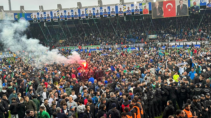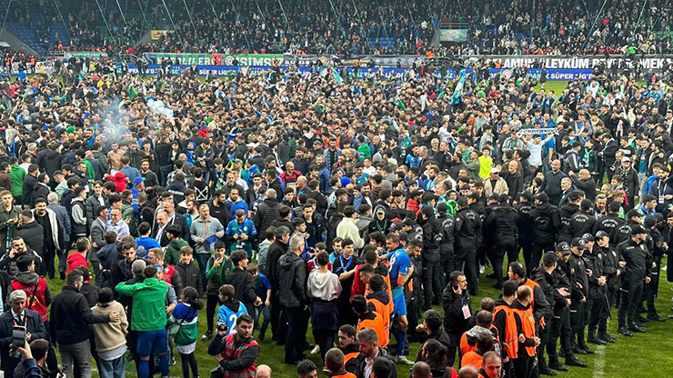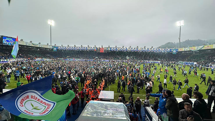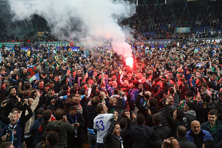 Rizesporlu taraftarlar maçın son düdüğünün ardından sahaya girerek futbolcularla kutlama yaptı.