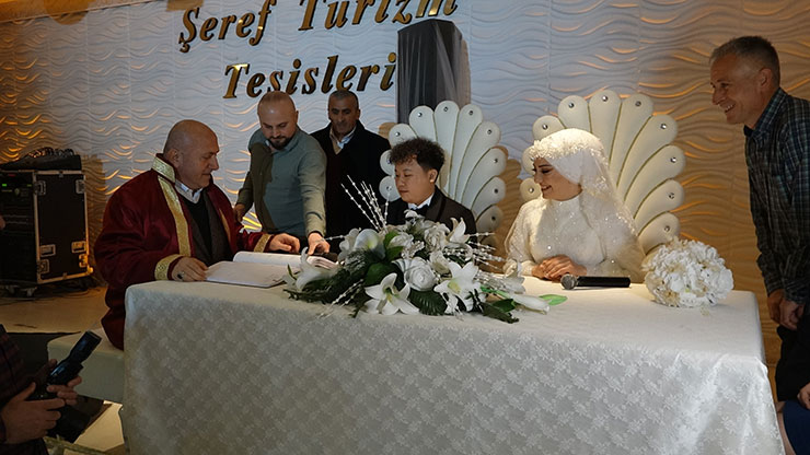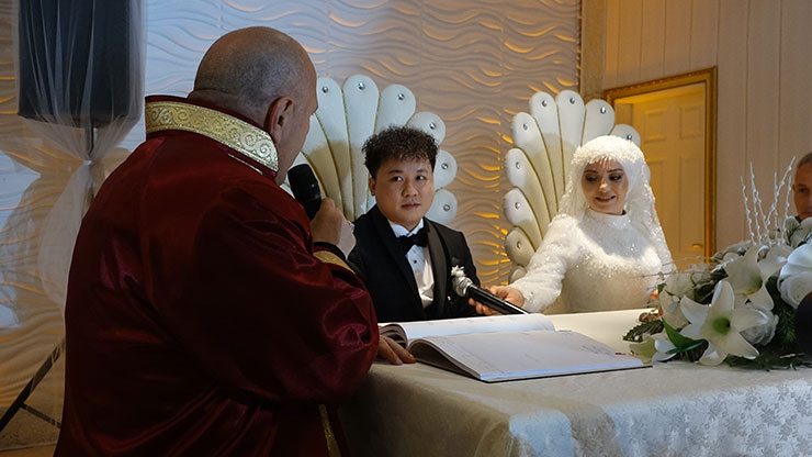 Çiftin nikahını ise Çayeli Belediye Başkanı İsmail Hakkı Çiftçi kıydı. Salonda taraflardan 'Evet' cevabını alan Başkan Çiftçi, sıra evlilik cüzdanını teslim etmeye gelince "Çin'de iki tarafın da gönlü olsun diye biri damada biri de geline olmak üzere 2 tane aile cüzdanı veriliyormuş. Burada tek cüzdan var ve biz taraf tutacağız" dedi.